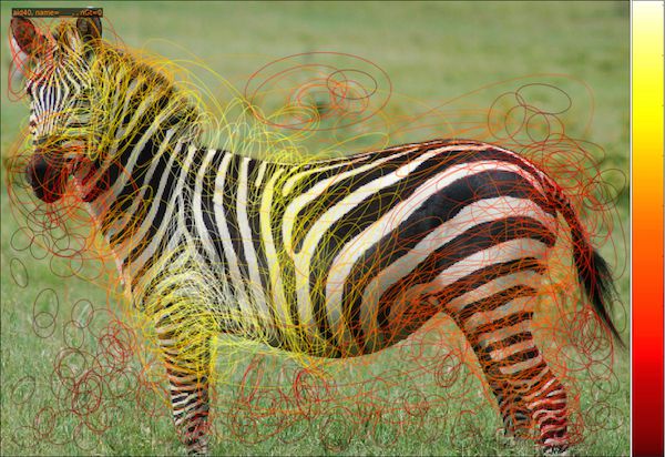 Keypoint descriptors. The oval regions are extracted within the bounding box based on how much useful information the algorithm can find. As we can see, the keypoints really respond the zebra's face, legs and mid body. The entire body of the zebra produces good, usable, informative keypoints. The background, however, produces small, and not very important keypoints. In order to be the most productive reviewer, always keep in mind what information these keypoints are trying to capture. [7]