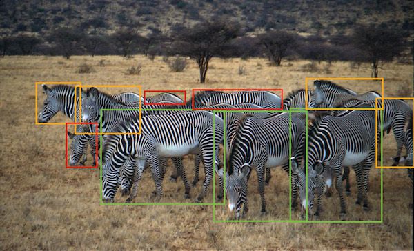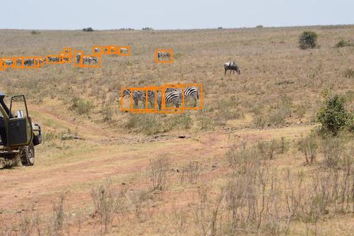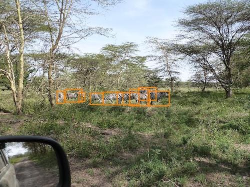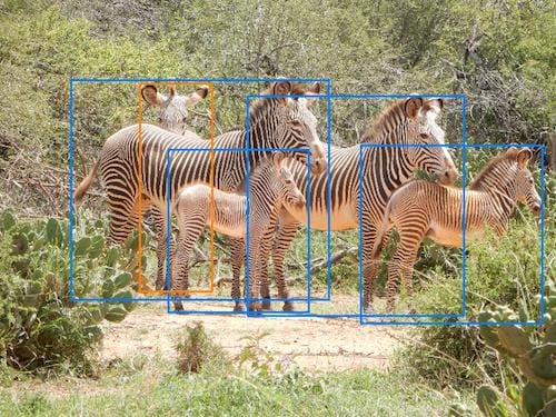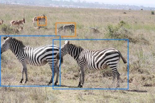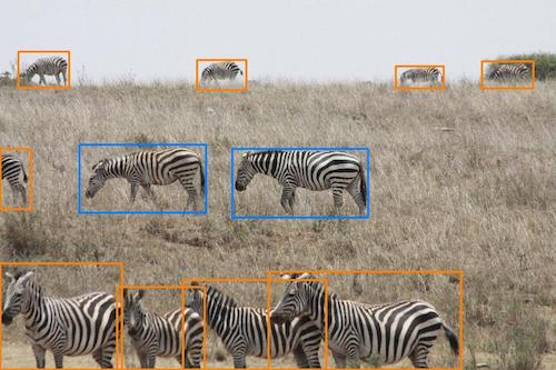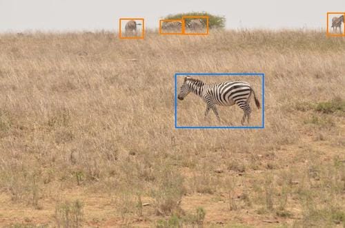 Assigning bounding boxes around an animal with severe occlusion can be very challenging. The green bounding boxes are obvious, but the orange and red examples can be harder to decide. For this example, all of the orange bounding boxes are border-line acceptable cases. The red bounding boxes, however, do not have very much usable information. This can be a very difficult decision and the image may have to be reviewed with the help of a graduate student. For this example, all of the red bounding boxes should be excluded because they are too small or do not capture enough information to be useful. [7]