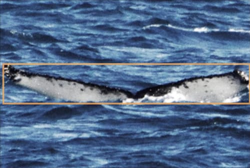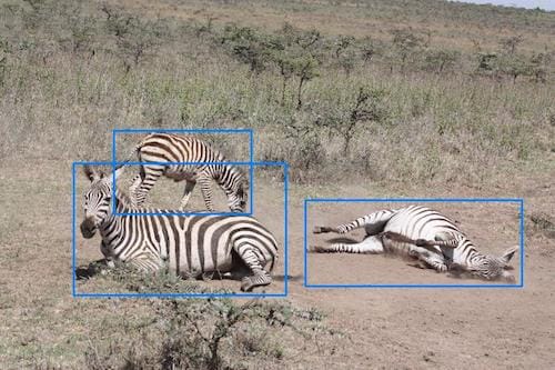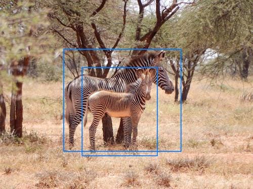 Whenever there is large overlap in animals that share roughly the same bounding box, always add a bounding box for each animal. Even if the resulting bounding boxes are almost duplicates, it gives WBIA a useful notion of how many animals of a particular species are in the image. For this example, both bounding boxes are necessary. [7]