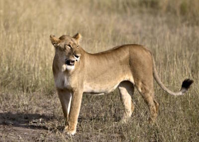 The Female Lion (Lioness) is distinguished from the Male Lion by the absence of a mane around the neck. The Lioness is also more lean and has a swayed back for hunting and stalking prey more efficiently. [7]