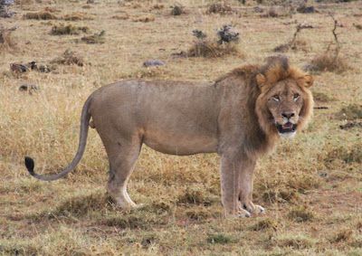 The Male Lion is distinguished by its large size, dark-brown or tan mane around the neck, and sleek, thin, tan coat. The Male Lion has a much larger head compared to the Cheetah and the juvenile males can usually be identified by the presence of testicles and the start of a mane. [6]